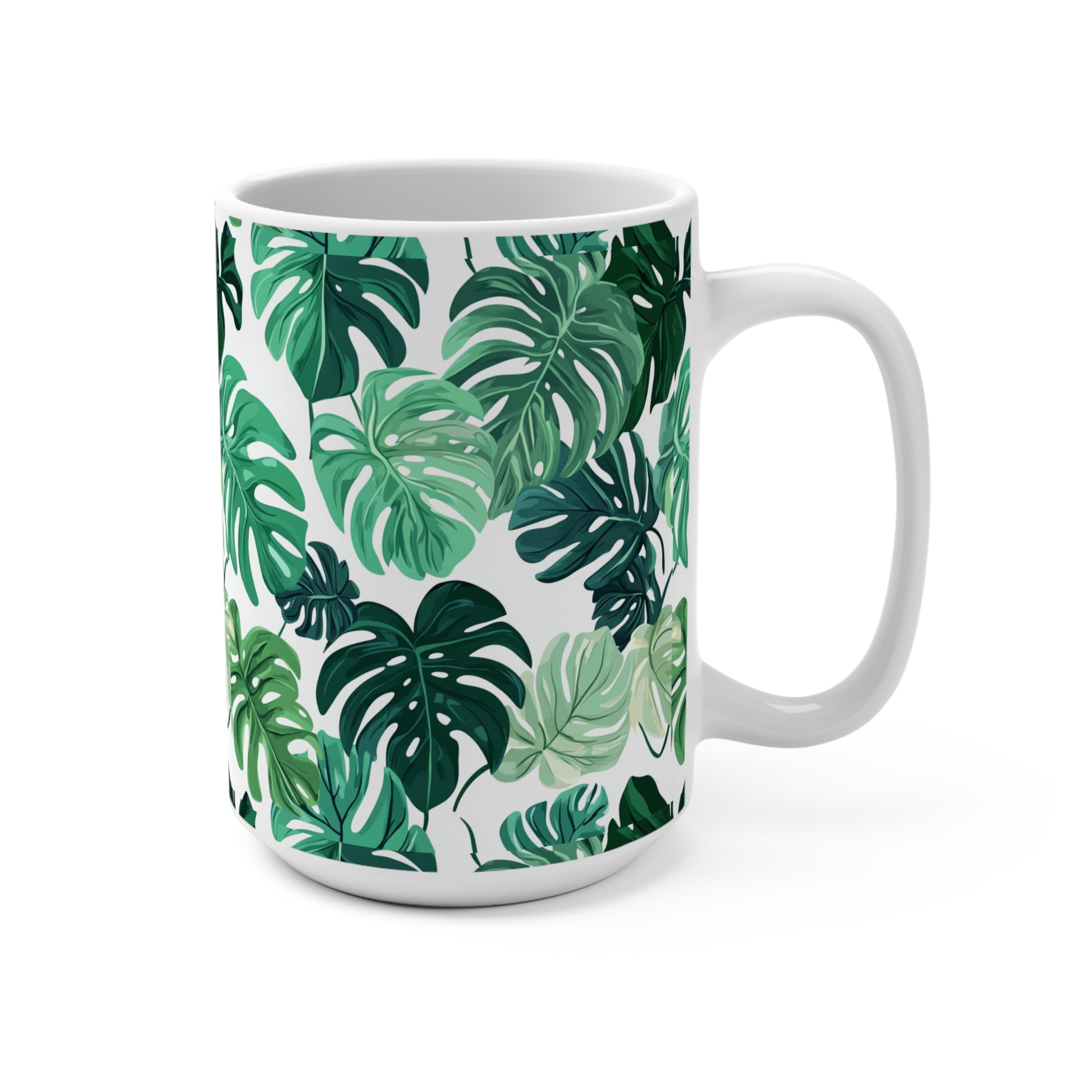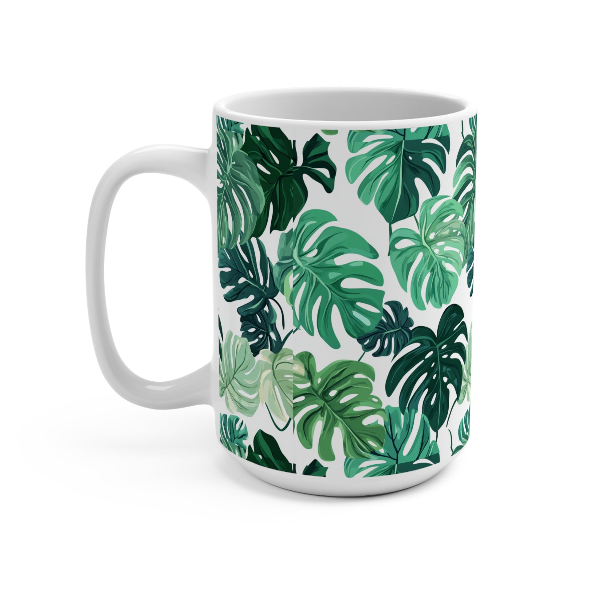 Introducing a beautifully designed mug that brings a touch of nature to your daily routine. Crafted from sturdy white ceramic, this 15oz mug features an elegant pattern of lush green leaves, perfect for those who appreciate the beauty of the outdoors. Enjoy your coffee, tea, or hot cocoa while surrounded by the calming vibes of nature. Whether you're working from home, enjoying a cozy morning at the kitchen table, or hosting friends over for a chat, this mug is sure to enhance any occasion.